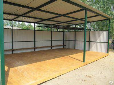 • Каркас — Профильная труба различного сечения: Колонны труба 80х80, обрешетка и связи из профильной трубы 60х60 и 60х40. Кровля — крашеный профлист любого цвета по желанию заказчика